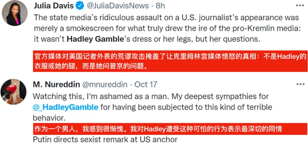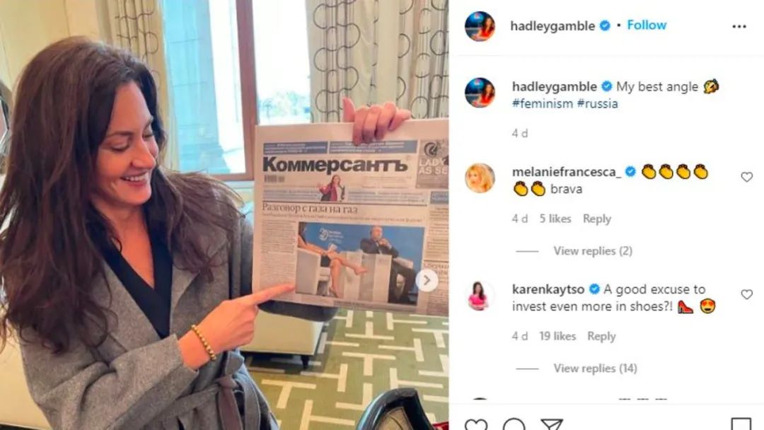 maohu 于 2021-10-21 19:58 写道: 原创:商务范 范主说:又美又霸气 上周,美国CNBC女主播Hadley Gamble,在俄罗斯能源周上采访了普京,结果因为肢体语言“太出格”,引发了不少争议~ 为了“应战”普京,这位姐瘦了十几斤,在采访当天把自己“挤进黑色紧身裙”里,穿着裸色Christian Louboutin高跟鞋,发问时还频频抬腿、眨眼↓ 俄罗斯媒体把Hadley骂惨了,说她抹着“闪闪发光的身体油”,像是穿越到《本能》里一样,故意引诱采访对象分心。 话说这个动作的确比较惹非议,之前川普准儿媳金伯利·吉尔福伊尔,在福克斯电视台上班的时候,也因为“伸腿”被骂过... 不过,面对尖锐的批评,Hadley的态度就是——老娘完全不care。她反手就在ins上晒了自己和头版头条的合影,说那是自己“最好的角度”↓ 紧接着,又po出普京跟在她身后当"迷弟”的照片,展现“Power walk”↓ 最后直接放出杀手锏,秀朋友为她订的蛋糕,蛋糕上有普京的脸和“太漂亮了”字样...当时普京曾说:“你长得很漂亮,但好像没在听我说话!” 推特上也有不少网民站Hadley这方,认为俄媒愤怒的不是衣服和腿,而是她问普京的问题。 说起新闻界的女主播们,无论是外形、气场、采访中的表现,还是她们的婚姻,向来很有话题度。出圈的也特别多,西班牙王后莱蒂齐亚,嫁入王室之前就曾在西班牙国家广播电台工作~ 贝佐斯的热恋女友桑切斯,曾经也是女主播一枚↓ 今天,范主就给大家扒一扒,新闻界女主播都是什么画风吧~ |