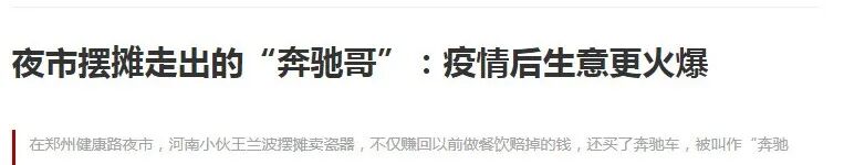 《新京报》后来居上,报道更夺人眼球:河南郑州的小伙子王兰波,他每天晚上摆4个小时地摊,仅仅只花了一年多时间,他不但赚回了之前做餐饮亏掉的钱,还买了一辆奔驰车,被称为“奔驰哥”。