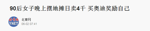 《北京青年报》也不甘人后,马上跟进报道:四川成都的90后女子傅傅,她利用晚上下班后的业余时间摆地摊,赚钱买了一辆奥迪作为5.20的礼物奖励自己。