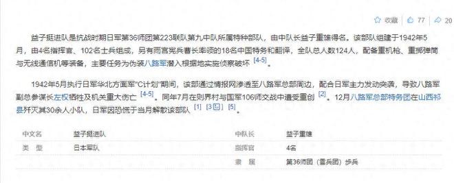 在《亮剑》里面,山本特工队可谓是相当厉害,一亮相就让独立团损失了200人,后边,更是突袭八路军总部,让赵刚率领的二营和三营损失不小,后边,更是突袭独立团的团部,好在李云龙调集全团兵力,用一门意大利炮,才将其全部歼灭,可见山本特工队的厉害,可你有没有想过山本特工队实际上是原型的。 这个原型便是大名鼎鼎的益子挺进队,这支部队是当时的日军第36师团第223联队第九中队所属特种部队,之所以叫益子挺进队,是因为这个连队的队长叫做益子重雄,这支部队的编制并不多,也就是4名军官加102名士兵组成,包括一些翻译在内,全队的编制才124人,但配备的武器可不差,包含了重机枪和掷弹筒,甚至还有无线通讯设备。 这支部队前后造成我军伤亡极大,甚至渗透到了八路军总部周边,他们卑鄙的地方是他们身穿八路军的制服,并且还会在部队进攻之前发动袭击,八路军副总参谋长左权的牺牲,也是因为这支部队配合日军发起了突袭,导致八路军来不及撤离,遭到了日军炮火袭击,最终,造成了左权将军牺牲和机关人员损失惨重。 并且在国军这边,也没有什么好的地方,国军106师曾经也遭遇到这支部队的袭击,不过,好在国军这边防守比较牢固,再加上他们历来对八路军的人不信任,当发现是日军时,果断展开了攻击,结果,在面对己方优势的情况下,106师居然还被这支部队打得找不到北,拉了一坨大的,愣是伤亡了500余人,把脸都丢光了。
