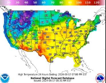 天气预报中心表示,虽然夏天要到周四才正式开始,但美国各地可能会打破或追平超过120个单日高温记录,其中大部分在中西部、大西洋中部和新英格兰地区。湿度上升会导致体感温度达到或超过100度。在一些地方,夜间的最低气温仍保持在70多度,热量几乎无法缓解。