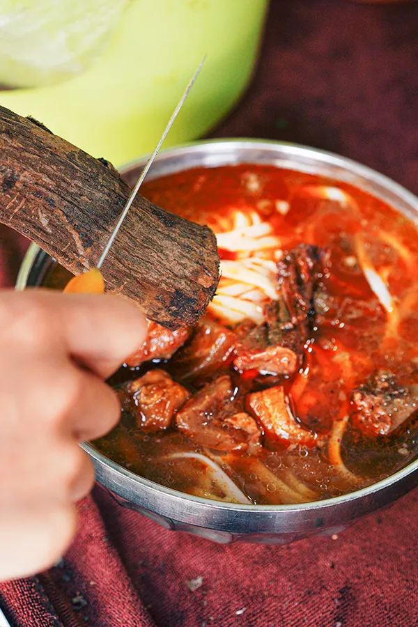 在云南芒市的清晨,随便走进一家米线店,你将能看到让你大吃一惊的场景——当地人正在吃树皮!只见他们左手拿着一截树根,右手握着小刀,随着两者的接触摩擦,“树皮”的碎屑就被削进一碗米线当中,当人管这种东西叫“山胡椒碎”。
