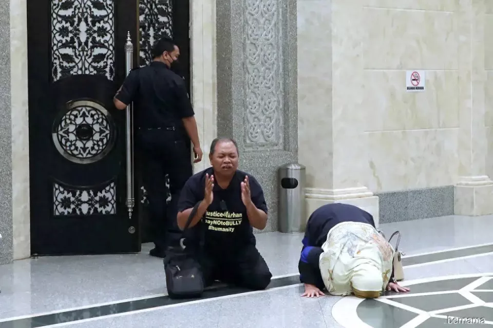 當地時間7月23日,得知殺害兒子的凶手們被改判絞刑後,馬來西亞國防大學學生祖法漢(Zulfarhan Osman Zulkarnain)的父母雙雙流下熱淚,跪謝在法院門口,不停磕頭。他們念叨著,“感謝上蒼,扞衛了我兒的正義。”出庭時,他們特意穿上印有“為祖法漢伸張正義”“對霸凌說不”等英文字樣的上衣。