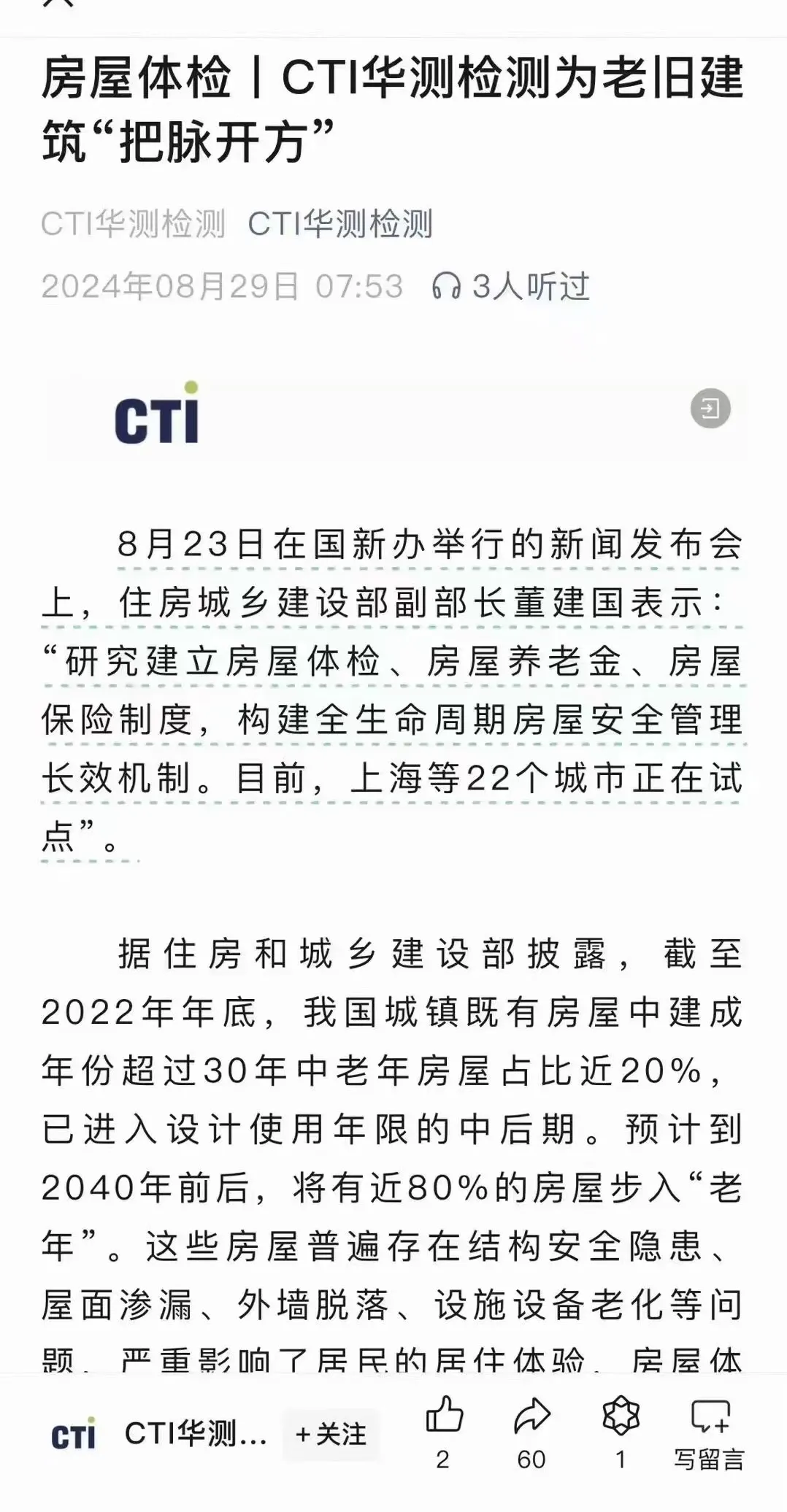 疫情来了,他们做核酸检测;房屋养老金来了,他们做房屋的安全检测。业务范围因时而动,而且能够精准跟上国家政策步伐,几乎是同步,那边刚宣布对上海等22城进行房屋养老金试点,这边就马上宣布已获得包括房屋安全鉴定资质在内的多项资质,不得不说:真厉害!