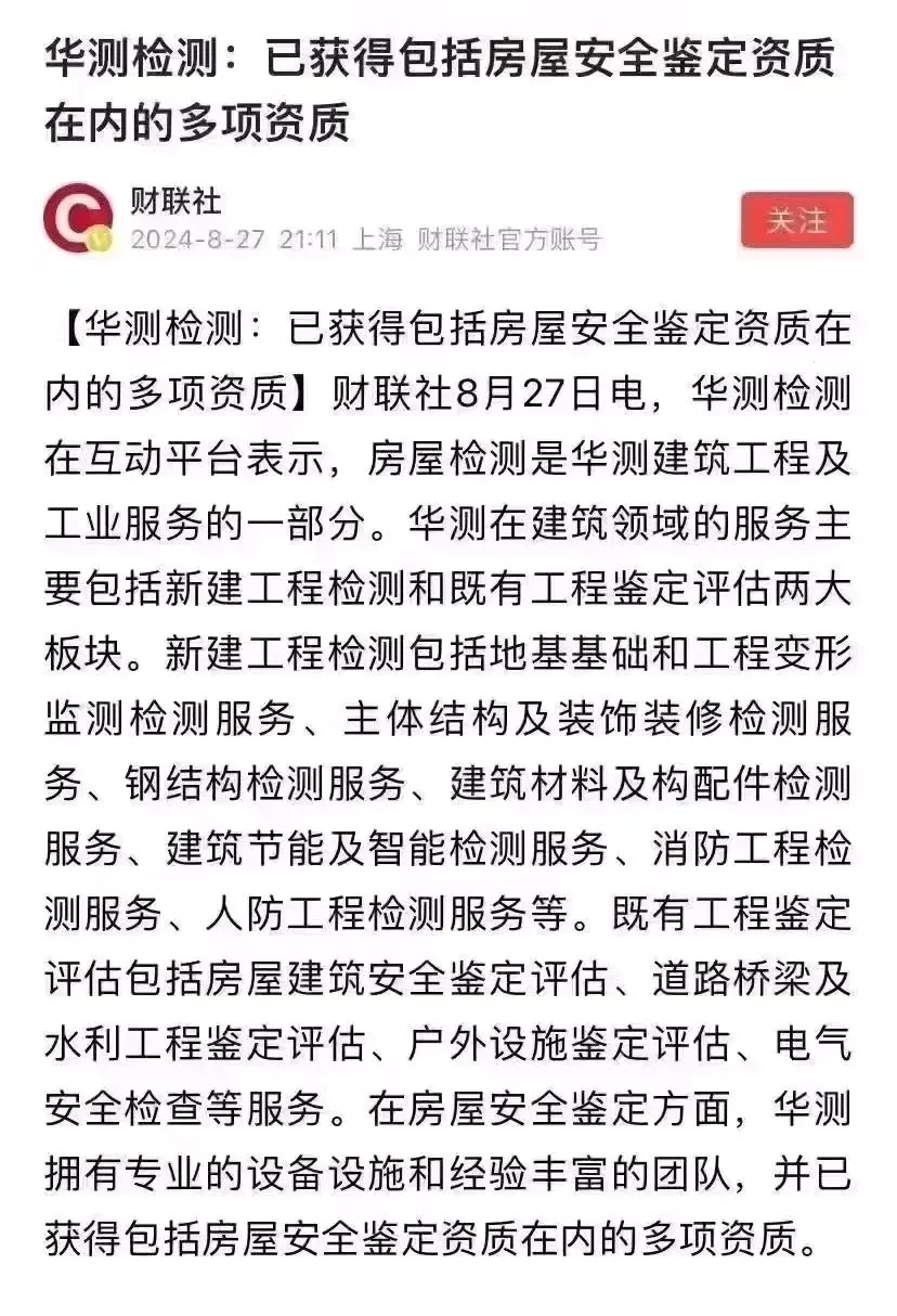 华测检测已经宣布进军房产检测业务,为老旧建筑“把脉开方”: