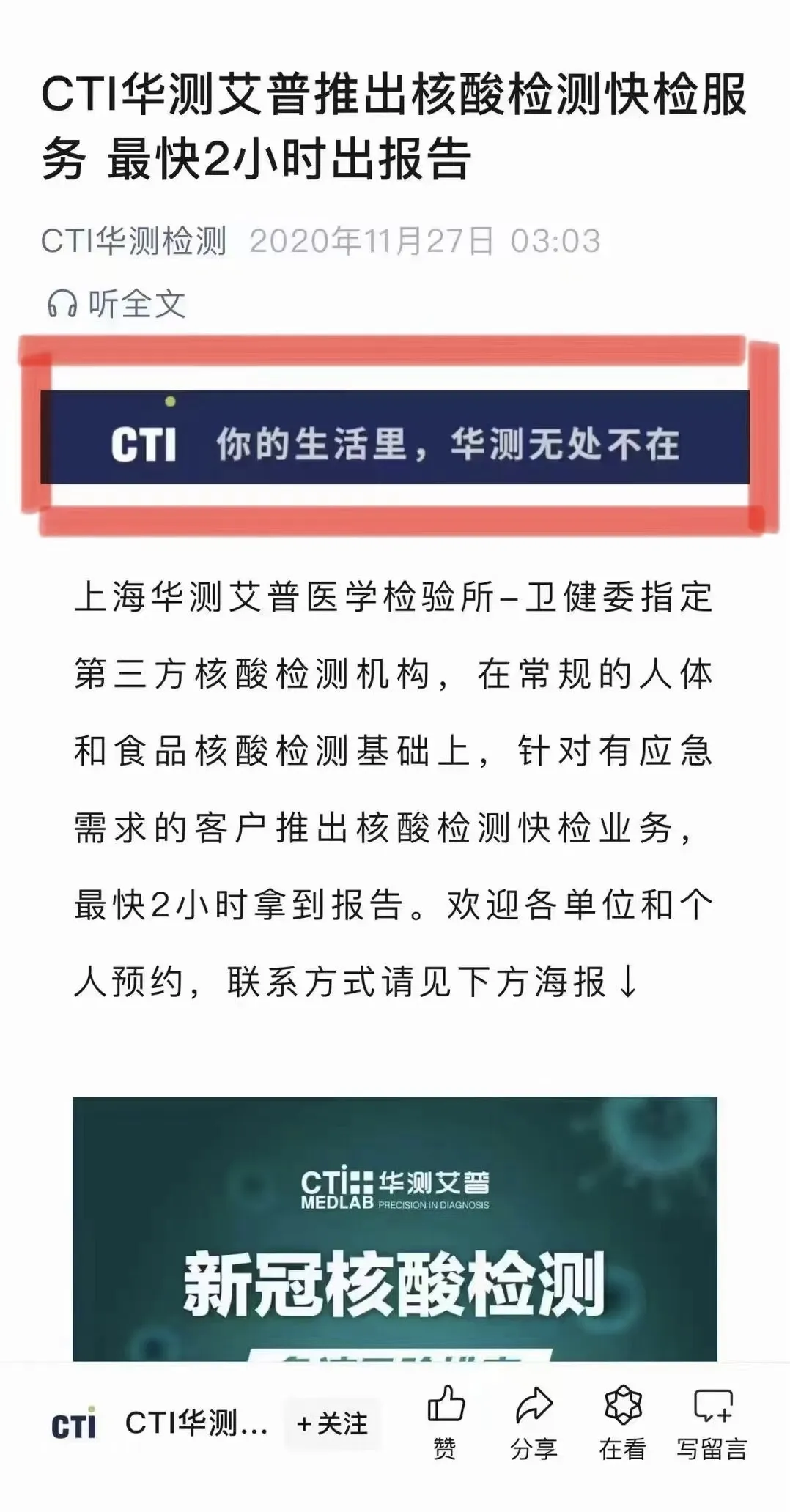 那个时候,华测检测占有相当的核酸检测市场份额,几乎哪里有疫情,哪里就有华测检测的身影。它不仅政策精通,信息快捷,而且最先推出核酸检测快检服务,最快2小时出报告。