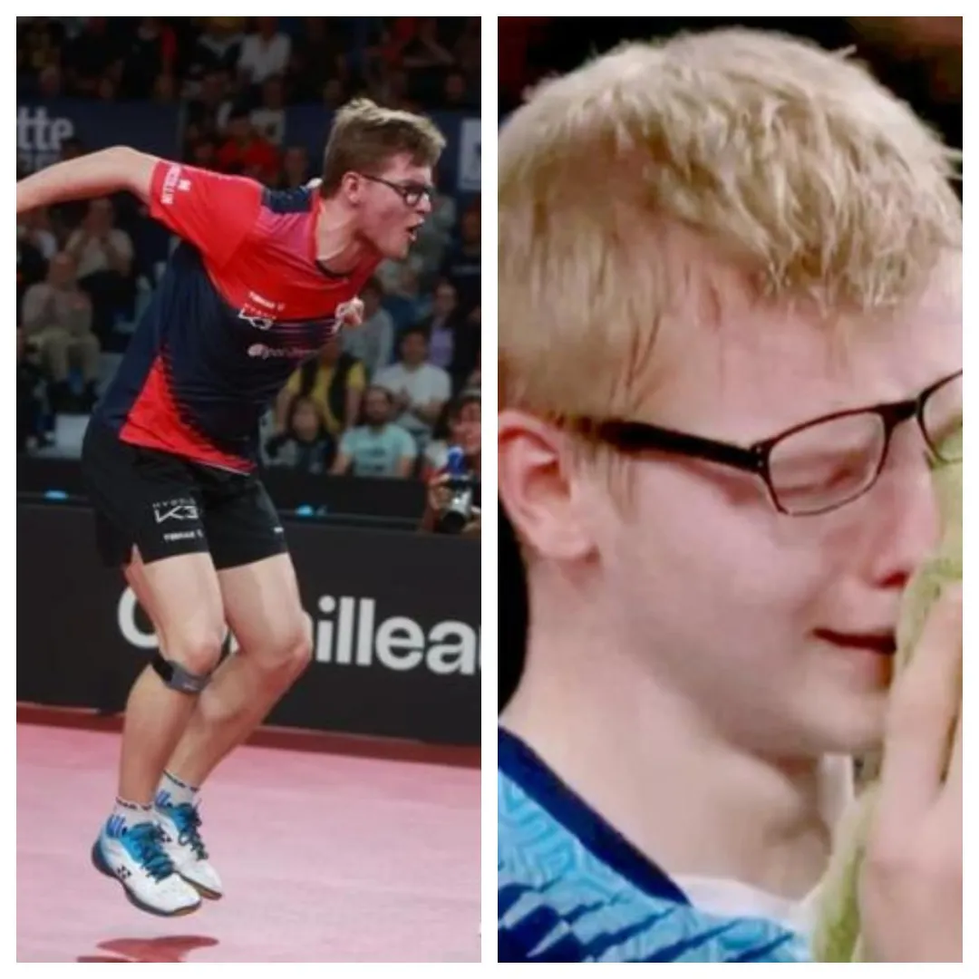 哥哥興奮得跳上球桌呐喊慶祝,而落敗的弟弟則掩面哭泣。