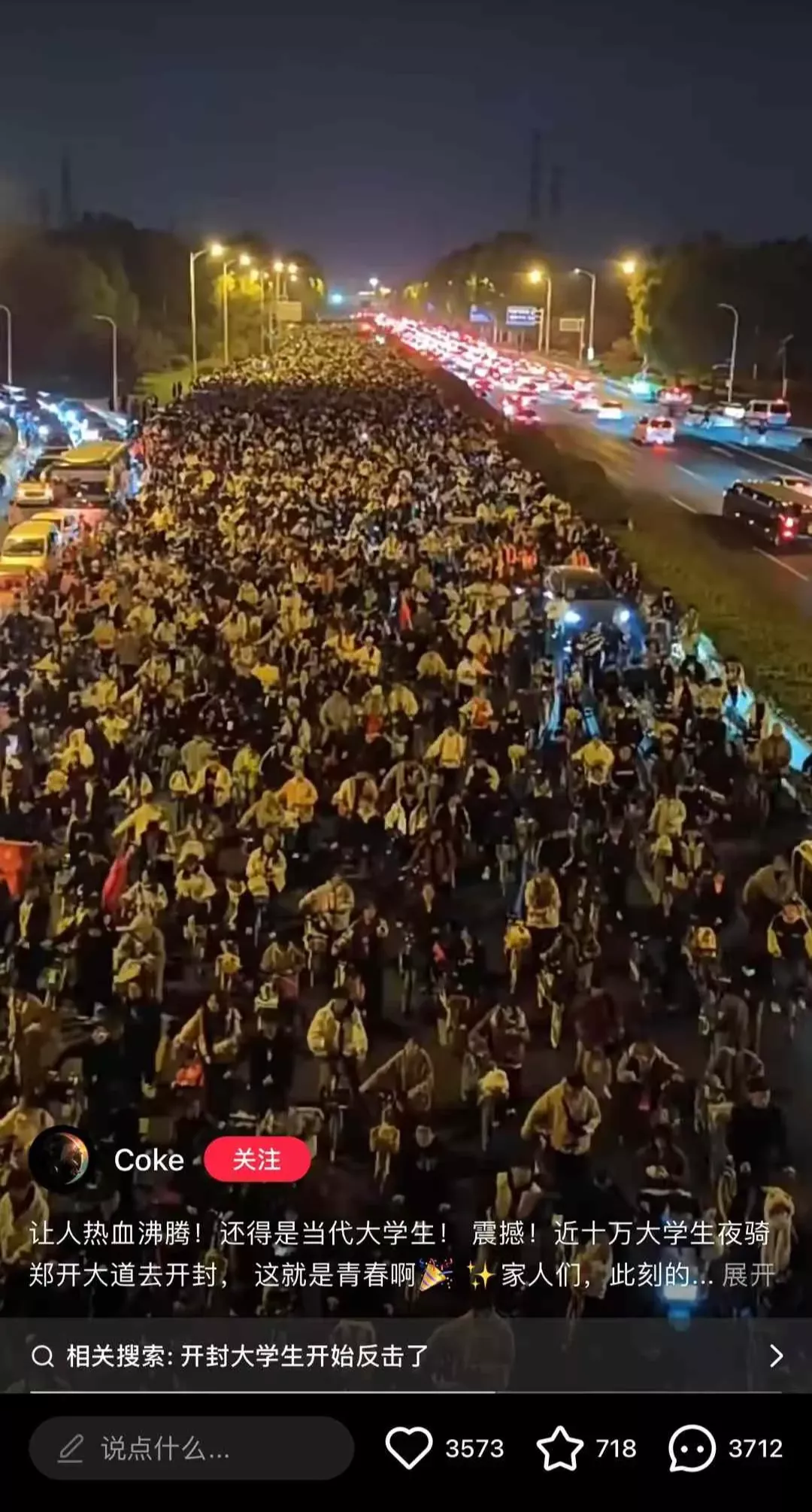 成千上万的大学生,凌晨从郑州出发,骑行5个小时,驶向50公里外的开封,这是一种新时代的盛大景观。