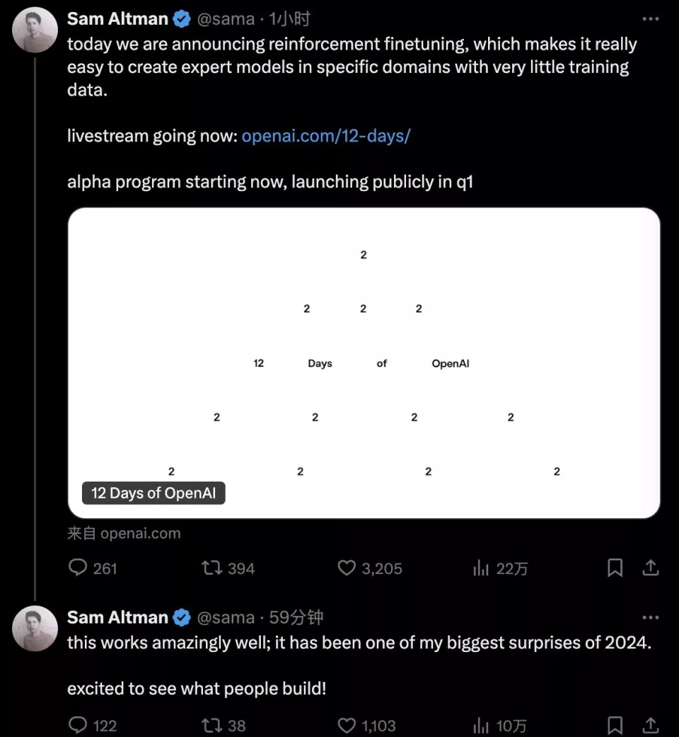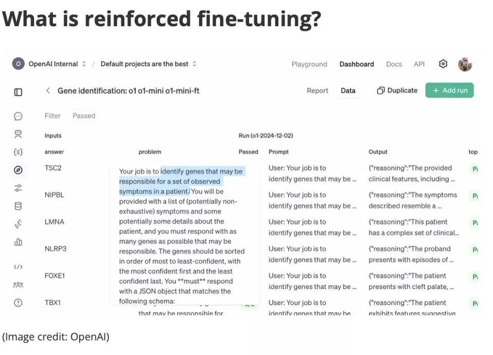 “今天我们宣布推出强化微调功能,这使得在特定领域创建专家级模型变得非常容易,即使只有很少的训练数据也能到。强化微调的alpha项目现已启动,正式版会在明年第一季度发布。”