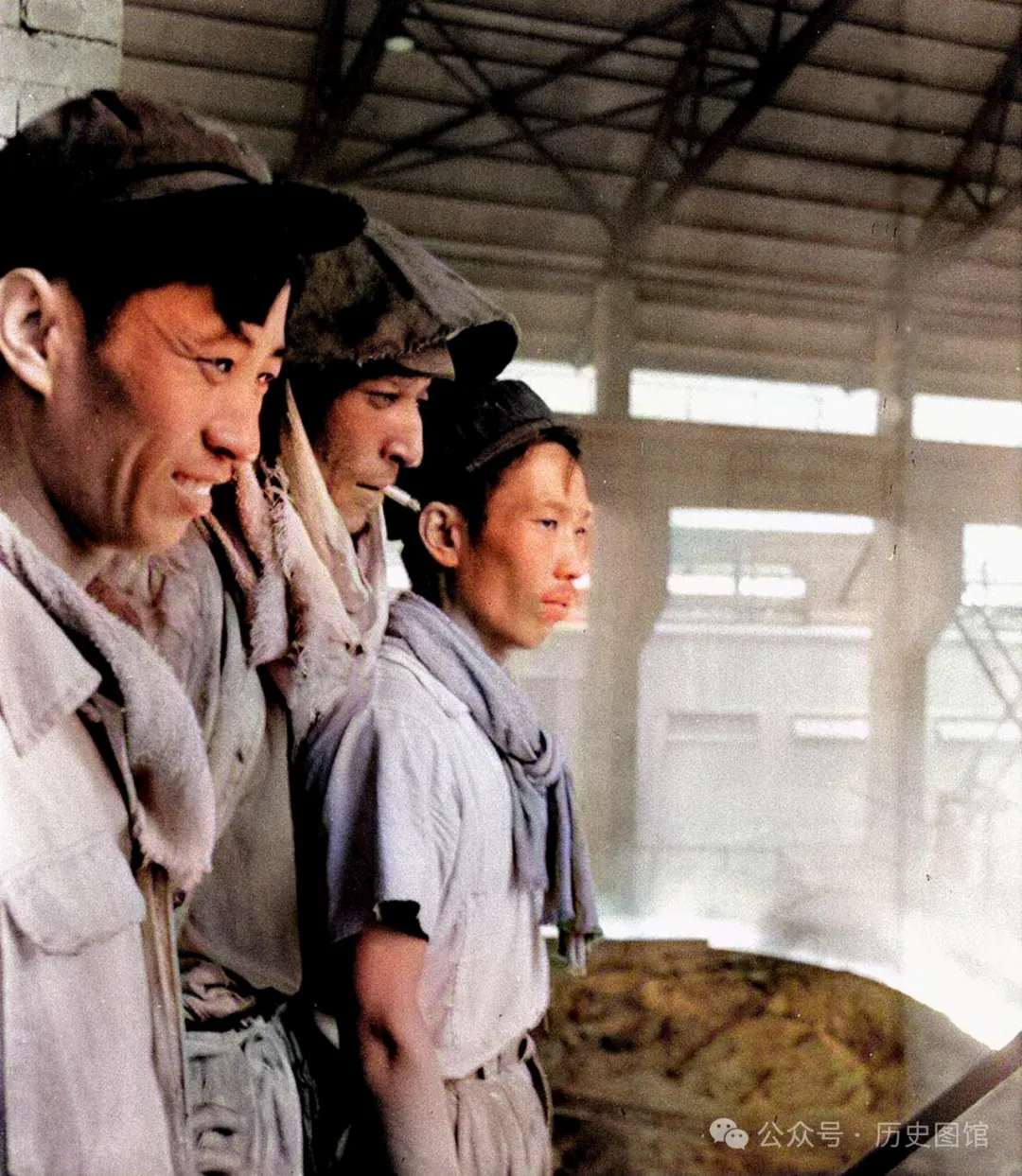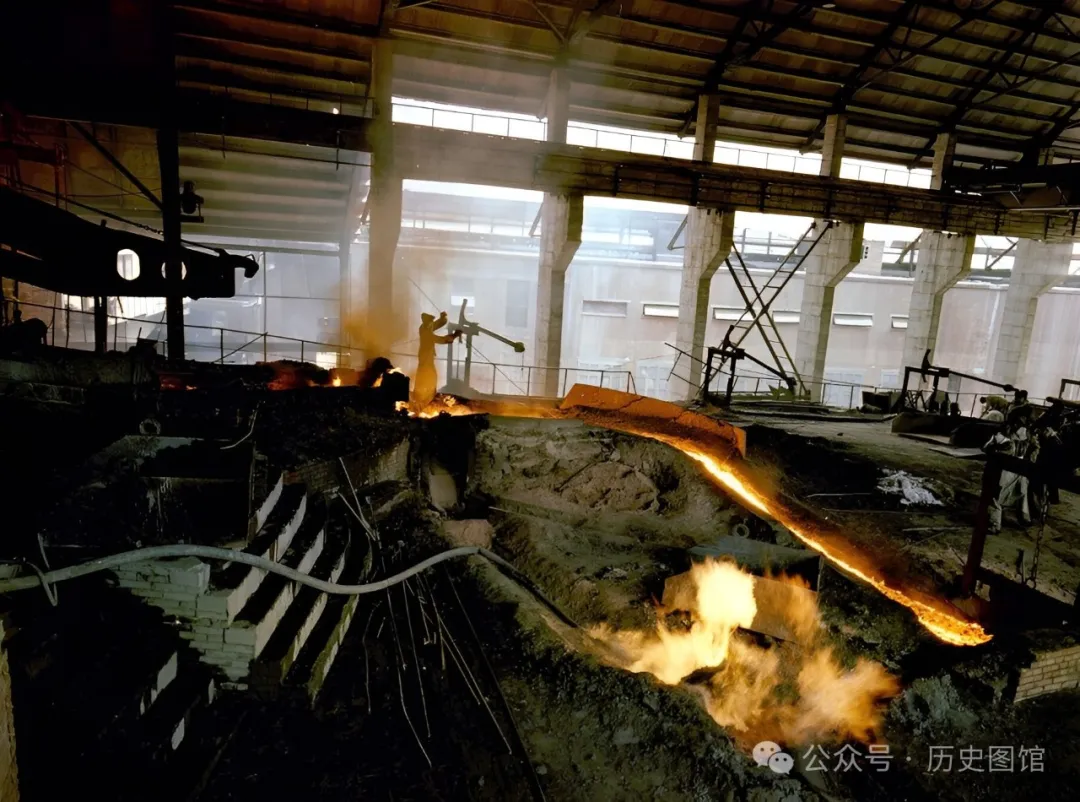 1959年,武汉一家钢厂车间内景象。融化的橘红色铁水犹如炽热的岩浆,看上去非常壮观。