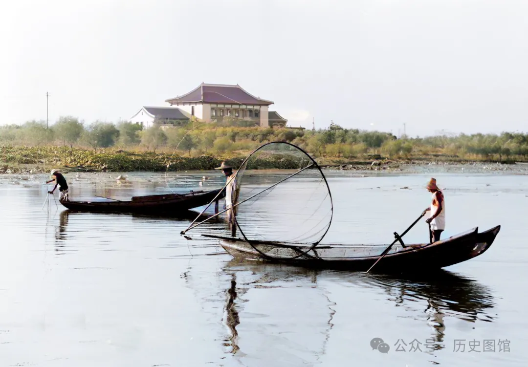1959年,武汉当地的渔民,划着小船在江面上捕鱼。他们使用的很少见的圆锥形渔网。武汉濒临长江,渔业资源丰富。