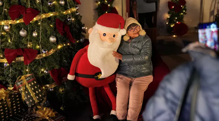 2024年12月24日圣诞夜,北京市一位女士在西什库天主堂与圣诞树与圣诞老合影。