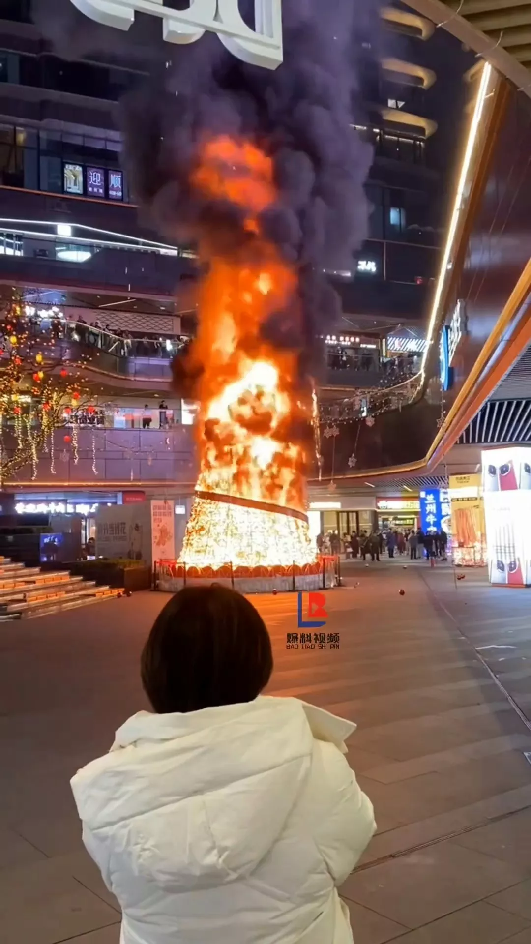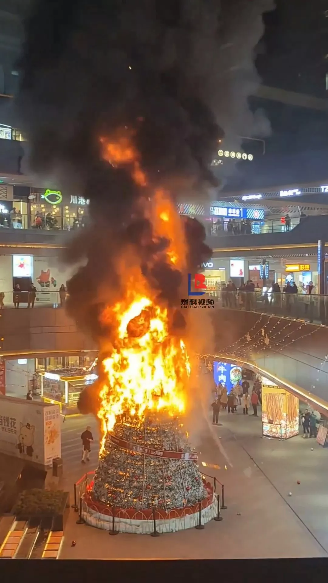 位于成都三利广场的10米高巨型圣诞树着火。(视频截图)