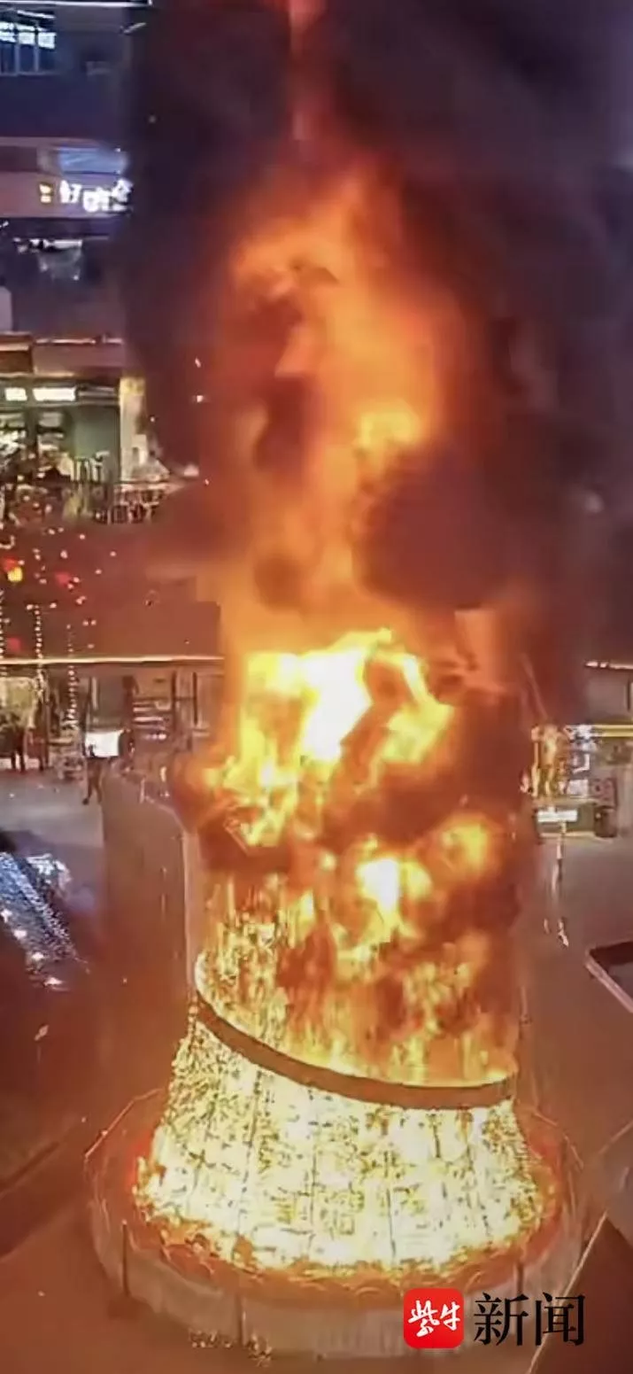 昨日(25日)晚上,位于成都三利广场的10米高巨型圣诞树着火。从视频可见,该圣诞树约两层楼高,火焰从侧面开始燃烧,迅速吞没整棵树体,火焰燃烧猛烈,现场还可以看见浓烟滚滚。