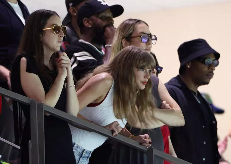 为男友、酋长队崔维斯凯尔西加油的泰勒丝出现在大萤幕时,遭到费城老鹰队球迷嘘声。(路透)