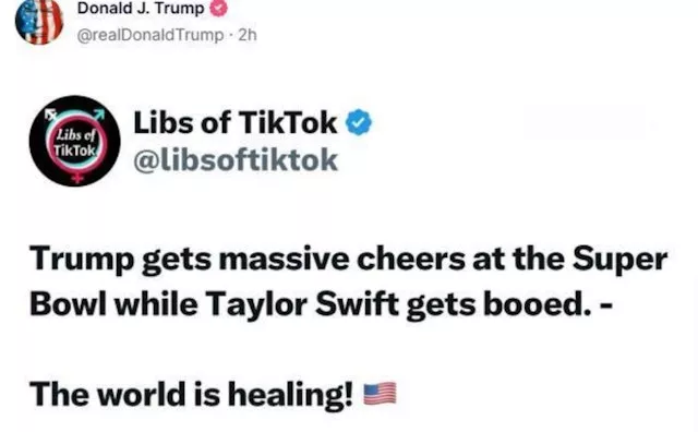 赛后,川普在其社群媒体平台Truth Social上发文评论此事,称“MAGA非常不宽容!”他还转发了一则将他和女儿伊万卡鼓掌的视频与球迷嘘泰勒丝的视频并列比较的贴文,该贴文写道:“川普在超级盃上获得热烈欢呼,而泰勒丝则被嘘。世界正在疗癒!”