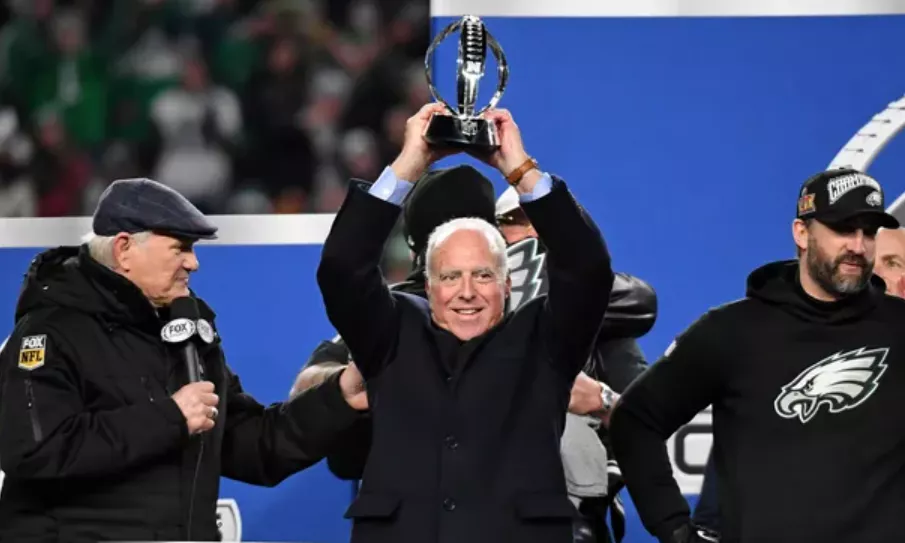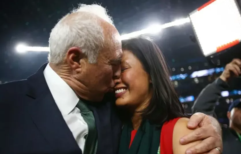 在周日的超级碗比赛中,电视画面多次带到费城老鹰队的包厢,赢家老板杰弗瑞·卢瑞(Jeffrey Lurie)与他的妻子赖蒂娜(Tina Lai,音译)一同为球队加油。