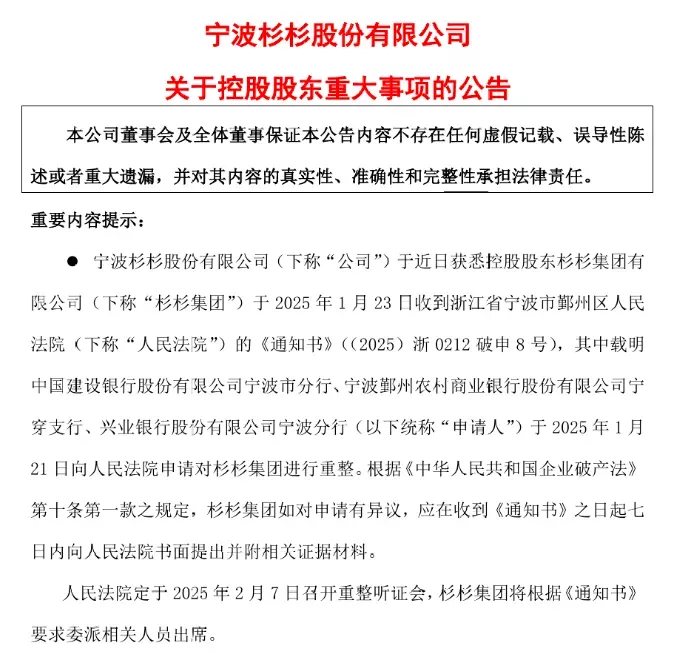 面臨破產重組危機的杉杉,在2025年2月7日寧波迎來重整聽證會。