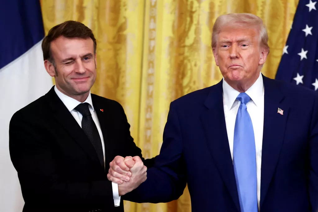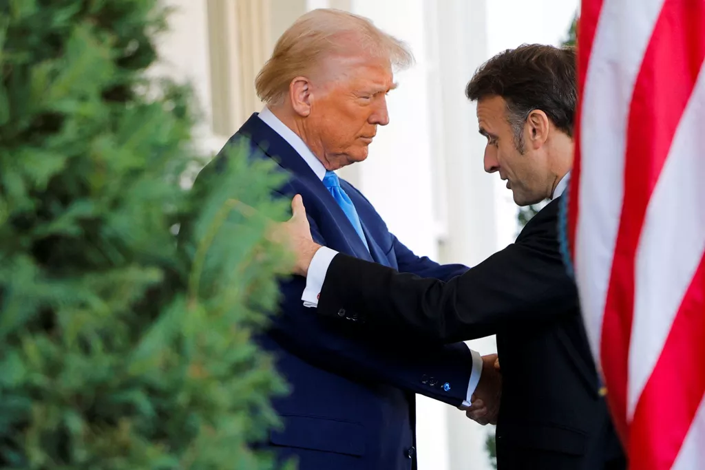 法国总统马克龙24日在白宫会见川普时,直接打断、纠正川普发言,但川普没生气,引发媒体关注。画面为川普与马克龙24日在白宫召开记者会时合影。(路透社)