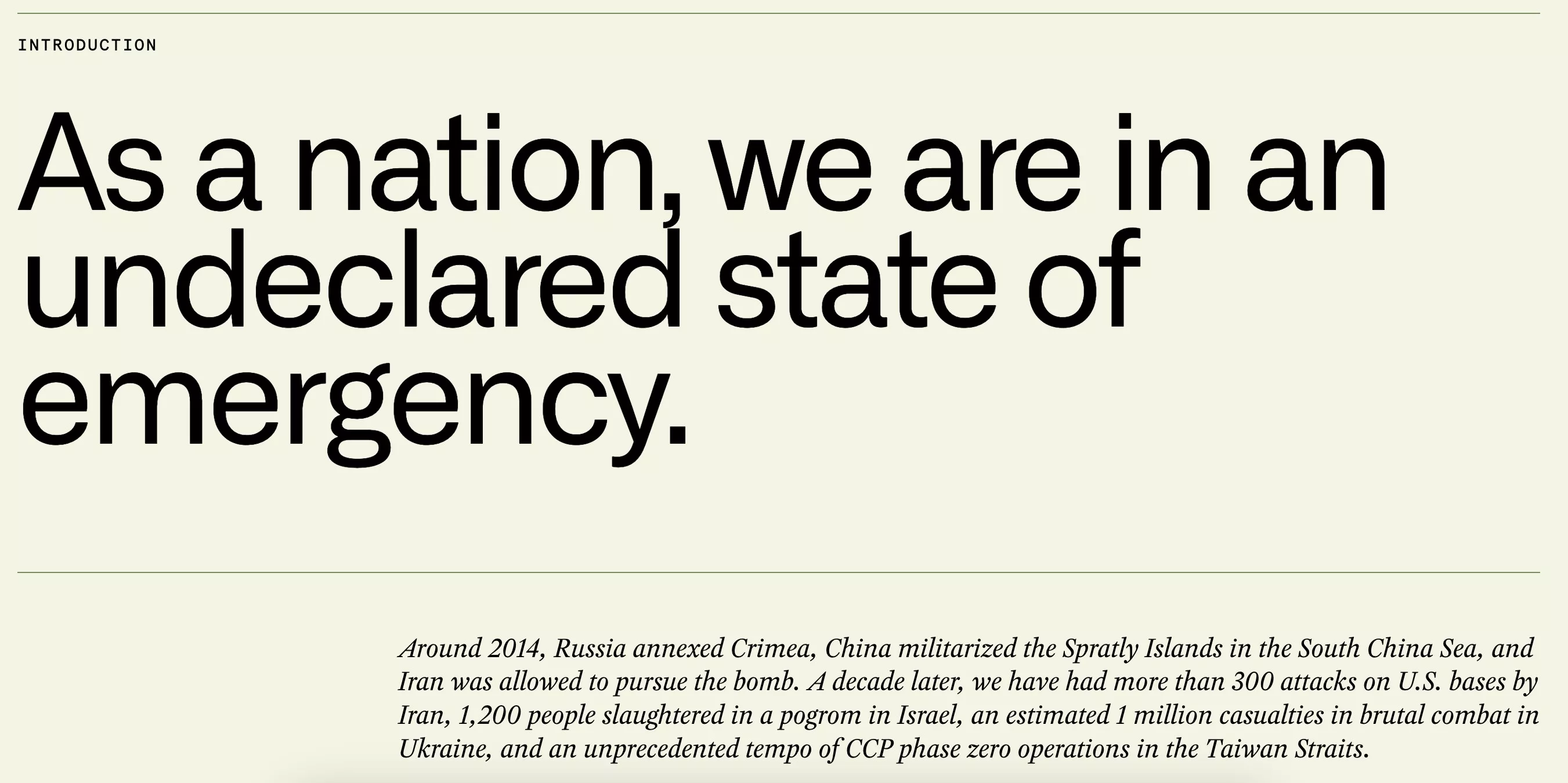 在其“国防改革”(The Defense Reformation)长文中,Palantir技术总监(CTO)Shyam Sankar直指,“作为一个国家,我们已在一个还未宣布的紧急状态之中”。(网站截图)