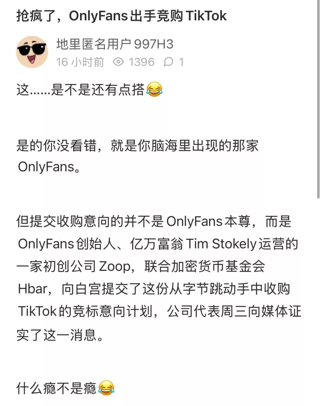 对于OnlyFans想买TikTok,网友们开始创作的段子频出。