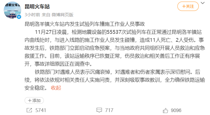 昆明火车站的“通报”写道:“11月27日凌晨,检测地震设备的55537次试验列车在正常通过昆明洛羊镇站内曲线处时,与进入线路的施工作业人员发生碰撞,造成11人死亡、2人受伤……该站运输秩序已恢复正常,伤员救治和相关善后工作正有序展开……”