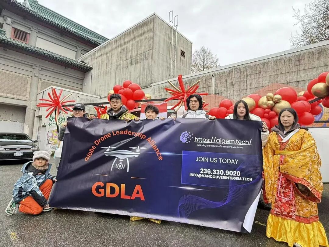 在今年的新春大游行中,來自中華文化中心唐人街大游行青年領袖代表:一支由青少年科技愛好者組成的國際無人機聯盟Globe Drone Leadership Alliance(GDLA)成為全場焦點。該聯盟成員均來自本地知名科技教育機構 Vancouver Integem,他們以“科技與傳統碰撞”為主題,精心設計裝飾花車,並現場展示無人機編隊與智能機器狗互動,將現代科技生動融入節慶氛圍,展現新一代青少年的創新活力與社區參與精神。