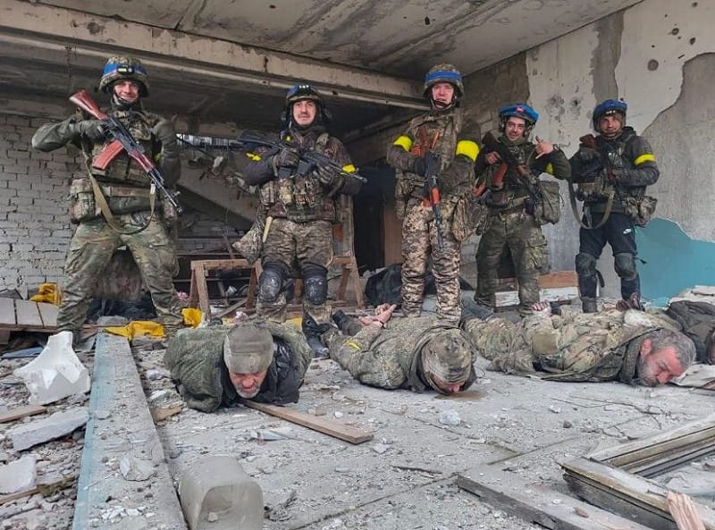 在前线行动中,乌克兰第 43 独立机械化旅报告,其士兵俘虏了一群原计划在哈尔科夫州基夫沙里夫卡镇插上俄罗斯国旗搞“假旗行动”宣传的俄军。