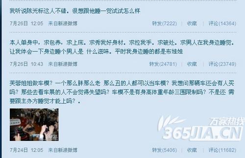 7月26日10点43分,网络红人凤姐罗玉凤在微博中称:“本人单身中,求包养,求上床,求秀我好身材,求拉我手,求破处,求男人在我身边睡觉。让我体会一下身边睡个男人是什么滋味。平时我身边睡的都是布娃娃。”该微博一经发出便引起众网友的评论和转发,截止目前,该微博已经被转发24781次,网友留言23749条。