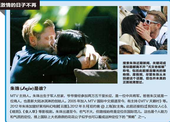 今年5月朱珠和尤文圖斯老板拉普-艾爾坎一起高調觀看尤文圖斯意甲的比賽,拉普親吻朱珠,緊接著兩人攜手走上戛納電影節紅毯,導致兩人戀情曝光。近日,拉普和億萬名媛街頭約會激吻被拍,朱珠戀情告急,但卻毫無回應拒不接受采訪。記者對話朱珠,在訪談中,朱珠在被問到“是否懼怕大家說你傍大款”時回答:所有這些東西只是我的一個經歷,只是我人生故事中的一個段落而已。