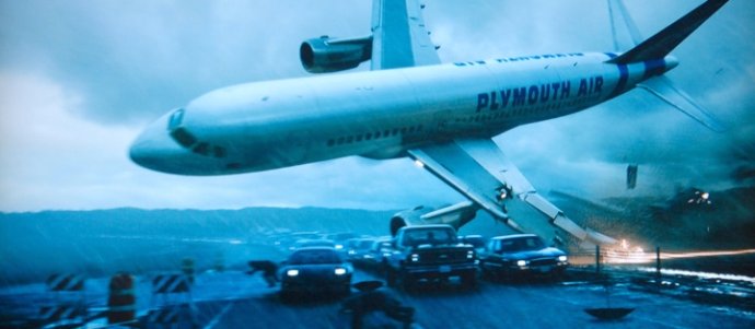 图为电影《先知》里面飞机因受到太阳风暴的影响失事的画面。