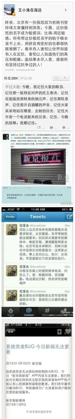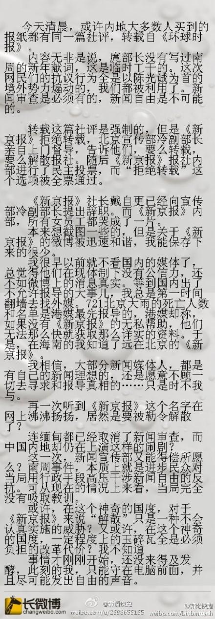 知情人士提供长微博,披露:元月8日,遵照来自“上方”的要求,全国大多数报纸都刊载了《环球时报》的社评,但是北京的《新京报》拖着没有刊载。当天,北京市委宣传部的冷副部长“亲自上门督导”,给出最后通牒:要么转载,要么报社解散。而该报坚决顶住。