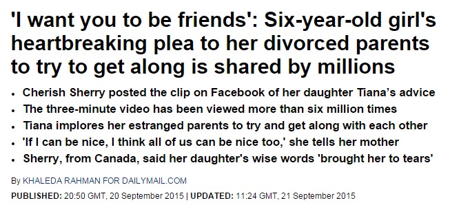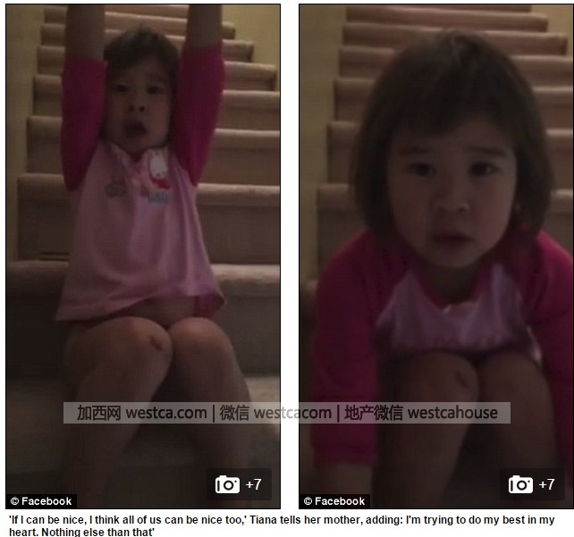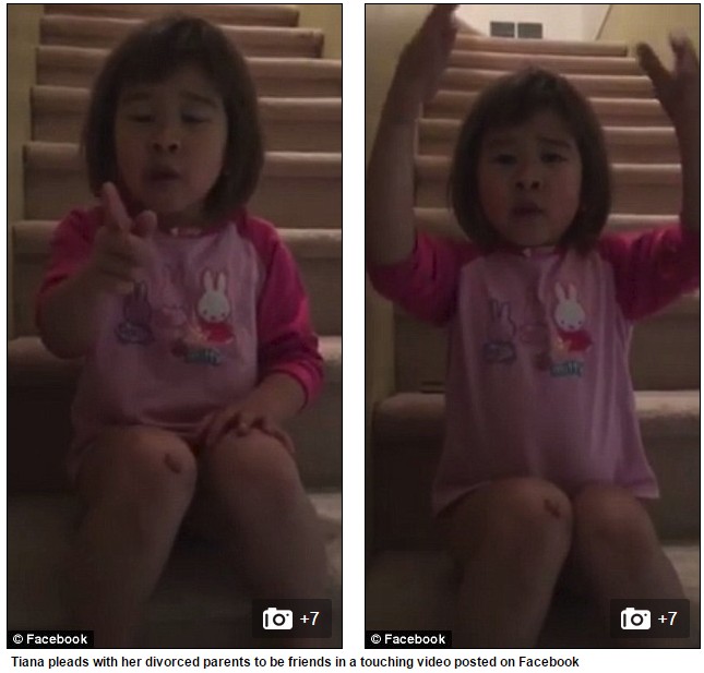 女儿Tiana今年6岁,又一次目睹妈妈和刚离婚的爸爸“争吵”(妈妈事后解释说只是没用啥好口气说话而已,并非女儿口中的争吵。。。)之后终于忍不住把妈妈拉到一边,然后自己坐在楼梯上,试着和妈妈好好谈一谈。。。于是有了下面这一段3分钟的小视频