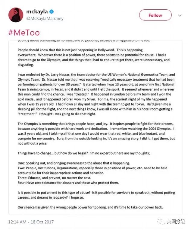 受到很多女星的鼓励,美国前女子体操运动员麦凯拉·马罗尼 (McKayla Maroney)鼓足勇气,将她所经历的一切说了出来: