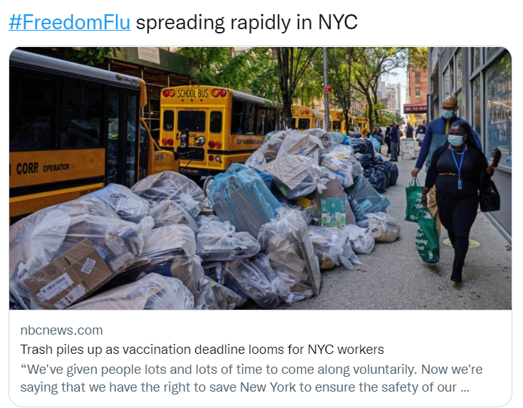 这里是美国纽约,环卫局工人不满强制疫苗接种,恶果逐渐体现出来了。