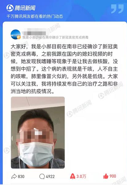 2021 年 12 月 3 日,红星新闻曾报道因公派驻南非的中国人郝先生感染奥密克戎毒株,成为首个被披露感染了此毒株的华人一事。