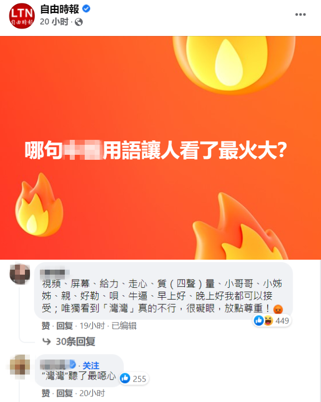 13日,島內深綠媒體《自由時報》發起了一項調查,征集網民看了“最火大”的大陸詞匯,最終“灣灣”一詞獲七百多人提名,被頂上熱評。
