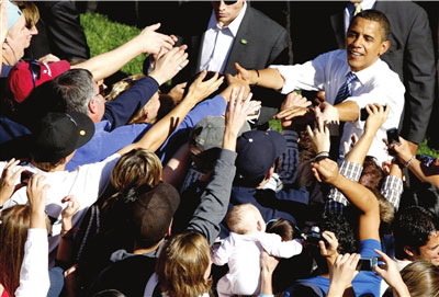 9月30日,奥巴马(右)在内华达大学举行的选举集会上与支持者握手。