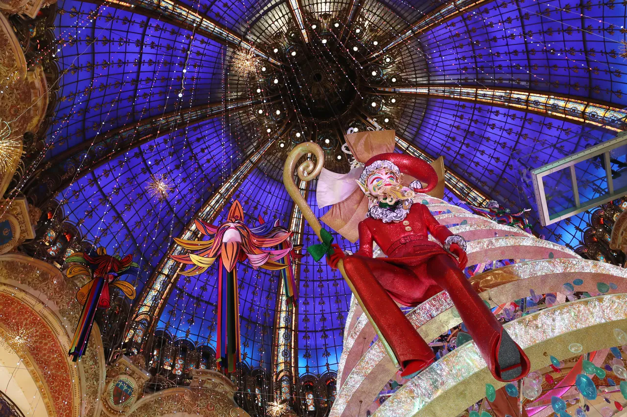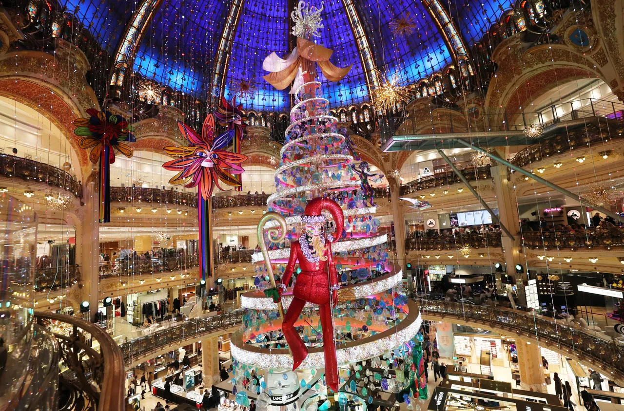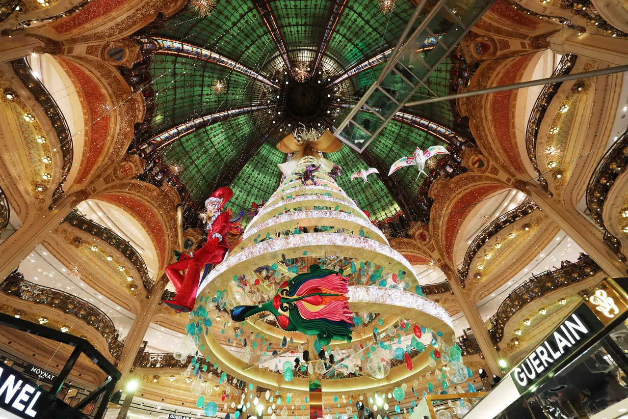 法国巴黎老佛爷百货的巨型圣诞树上周揭幕,老佛爷的圣诞树是巴黎圣诞季最具代表性景点,今年“漂浮圣诞树”由生日也在12月25日的设计师维尔莫兰操刀。