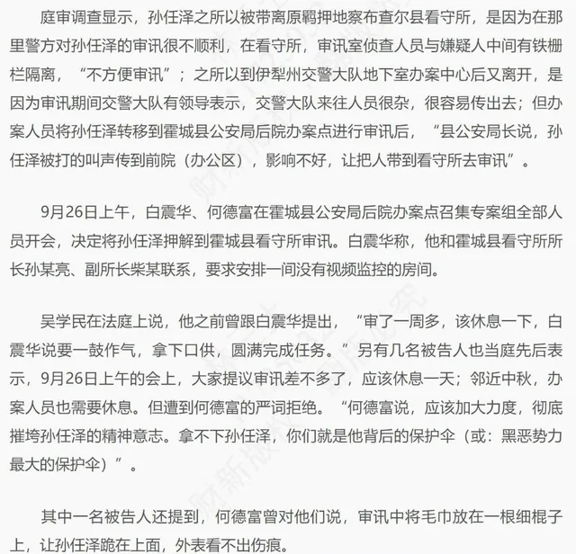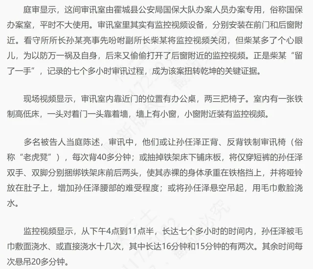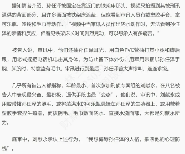 孙任泽被关押在伊犁州霍城县看守所期间,遭受了警方的刑讯逼供,包括:背凳子、捆绑、抹芥末、胶带拔腿毛、老式电话电击、生殖器吊重物、毛巾敷面浇热水等。