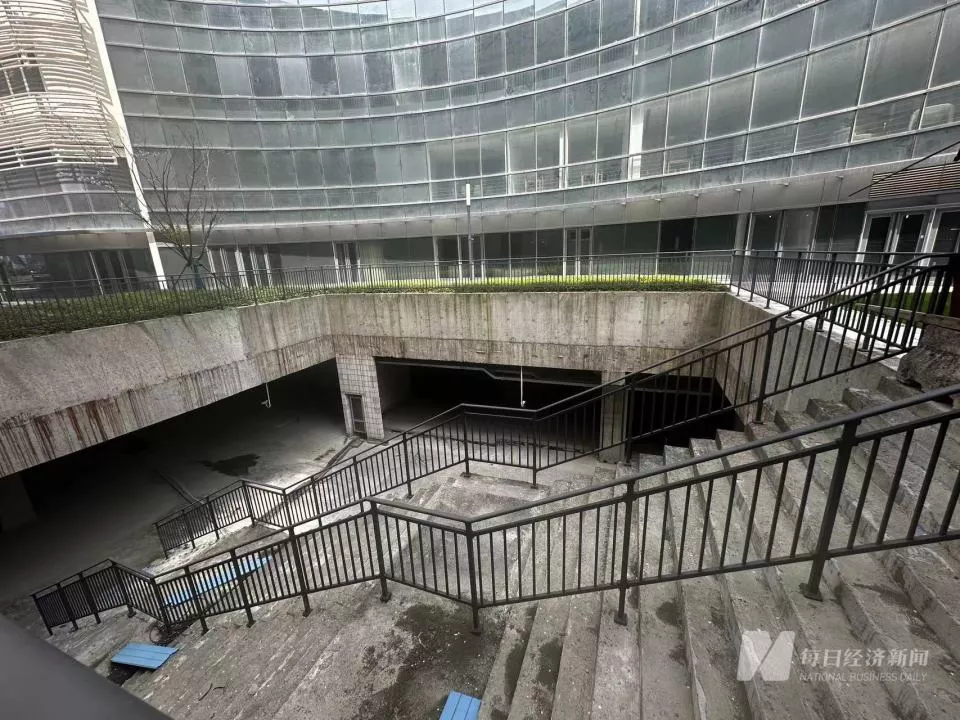 最高的两座双子塔建筑是兰韵文化中心核心的办公区域,一楼被大面积的招商广告围起。记者在建筑内看到,用于出租的办公区域仍有多个楼层空置。