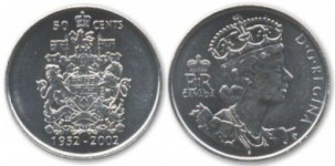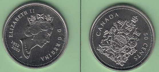 年份:2002 (1种) 钱币正面加拿大国徽上方,50和cents分列在皇冠左右两端;加拿大国徽下方,是Double年份1952-2002;钱币背面是女王盛装肖像,不同于以往历年钱币图案。