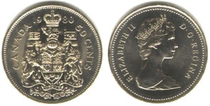 50分值钱币的正面图案从1937年开始,就一直沿用加拿大国徽,沿袭至今没有太大的变动。