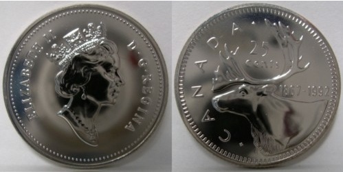 (2)钱币正面是纪念Canada Day的枫叶图案,背面在女王肖像的左下方有2行Double年份1952、2002,正下方是“25 Cents”。
