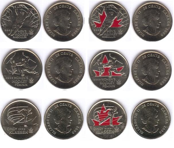 (9)第5枚彩色流通硬币, 币面是纪念加拿大在2002年冬奥会上男子冰球夺冠的图案,2002数字中最后一个2为空心;
