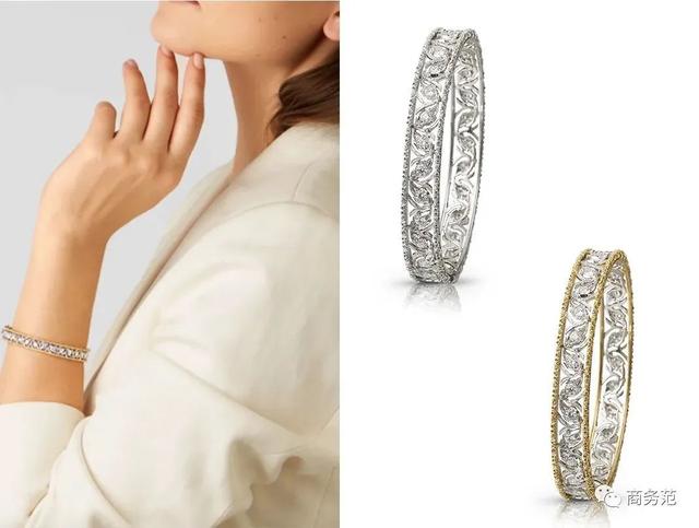 Ramage系列的手镯也不错,此系列的设计灵感源自于文艺复兴时期,是布契拉提的经典图案了,主要采用雕刻工艺,通过金匠全手工精雕细琢,呈现出细小的枝叶和钻石花朵图案,精致又优雅。