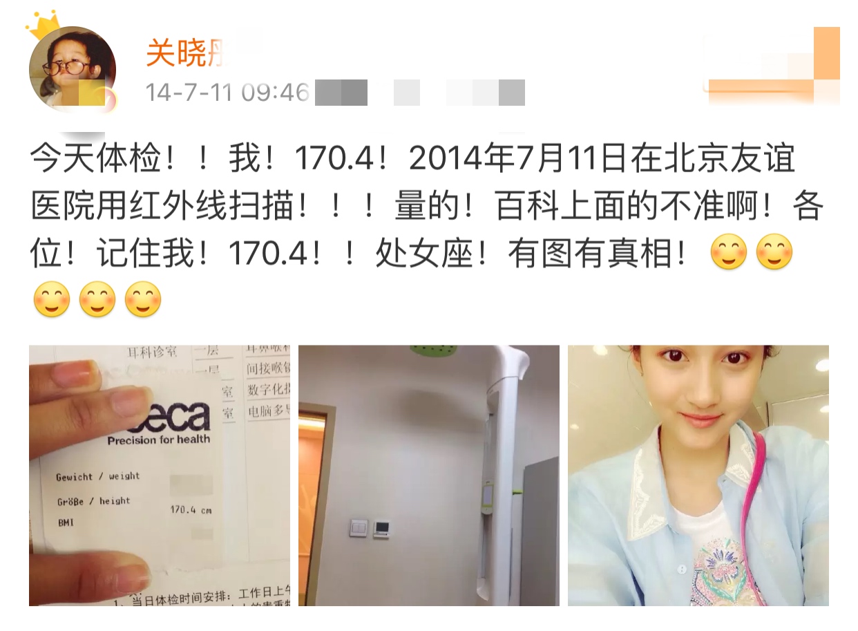 外界曾经谣传关晓彤的身高早就超过一米七五,结果逼得她17岁的时候跑去医院做检查,证明当时的自己只有170.4cm。