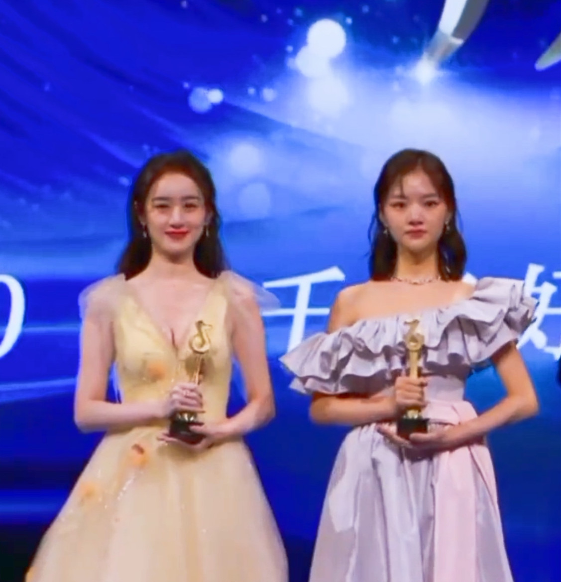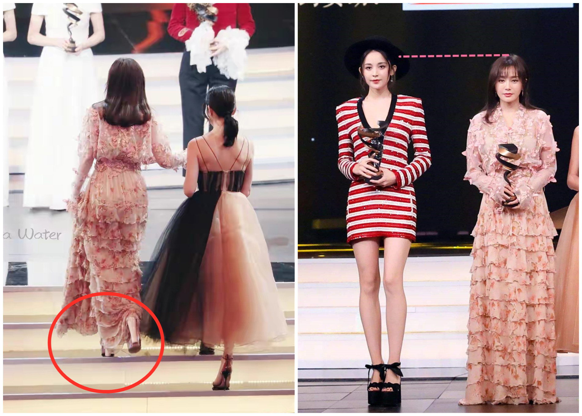 在百花奖的闭幕式上,穿着同色系服装的二人各具特色,可身高却形成鲜明对比,任敏足足比宋伊人高出半个头,穿着平底鞋的她甚至和穿着高跟鞋的孟美岐高度差不多。