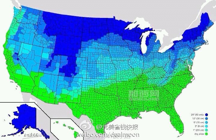 网友自制地图:美国各地要下多少雪才可以停课呢?