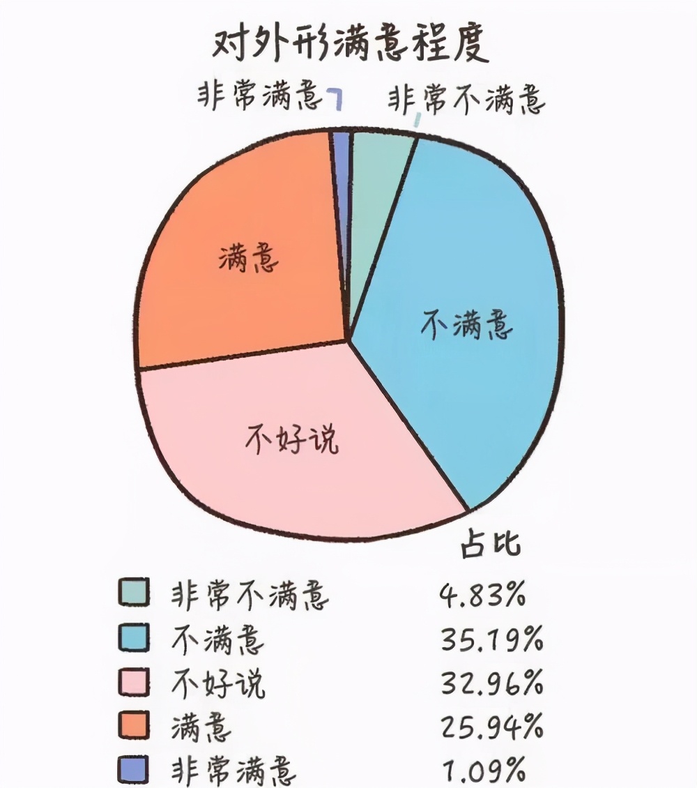 在“直男都有着迷之自信”成为社会共识之前,2019年1月份KY研究所发布了《中国人颜值报告》。出乎意料的是,男性对自己外表不满意的比例更高——分别有36.37%和5.90%的男性对自己的长相“不满意”和“非常不满意”,而对应的女性比例是35.04%和4.67%。